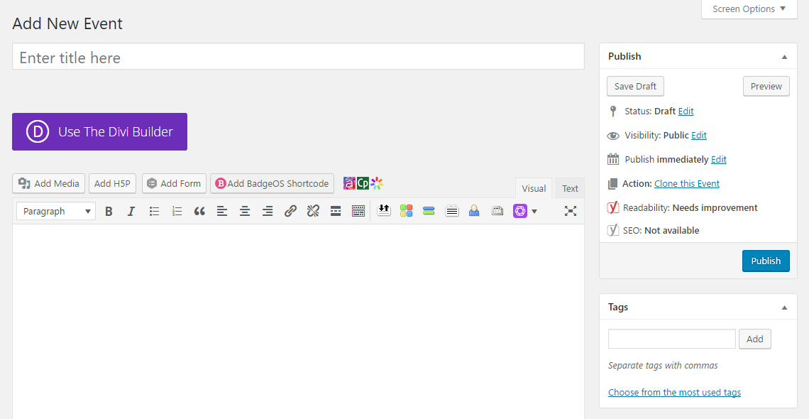 - Click on Add New. You’ll notice the event editor looks very similar to a page/post.
