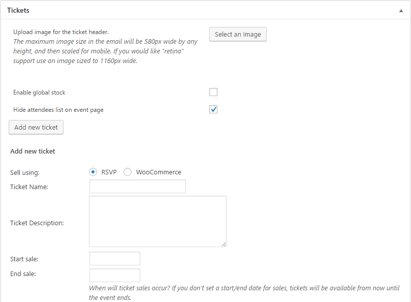 - If you are planning to provide tickets for this event, click Add new ticket in the Tickets section and enter appropriate information for RSVP (online booking only) or WooCommerce (online sales and payments through eCommerce). Click Save this ticket to save ticket information.