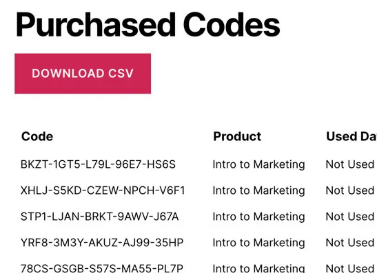 Create code products that sell specific quantities of codes from a batch. When users buy a certain quantity of codes, they receive the codes in a CSV file and can track redemption from their accounts. This is popular for selling accounts and course/membership access.