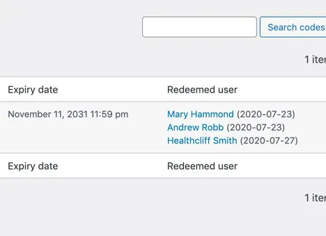 Administrators can see how codes are used, by whom, and when they expire. Detailed redemption records make it easy to audit code use and code availability right inside WordPress