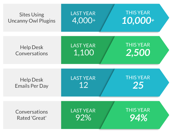 A year later, we wanted to look back and reflect on how things have changed for us. For one thing, we’re definitely a lot busier! And, as we come up on our 5 year anniversary (next week!), it’s even more important to take a look at what growth has meant to our level of service. Here are some key stats for Uncanny Owl over the last 12 months: