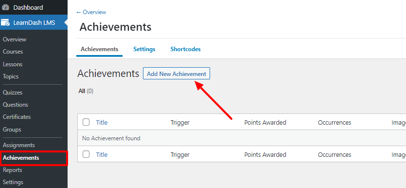 First, you need to head over to LearnDash -> Achievements from the left sidebar of your WordPress admin panel. This will take you to the Achievements page where you’ll see 3 tabs: Achievements, Settings, and Shortcodes.