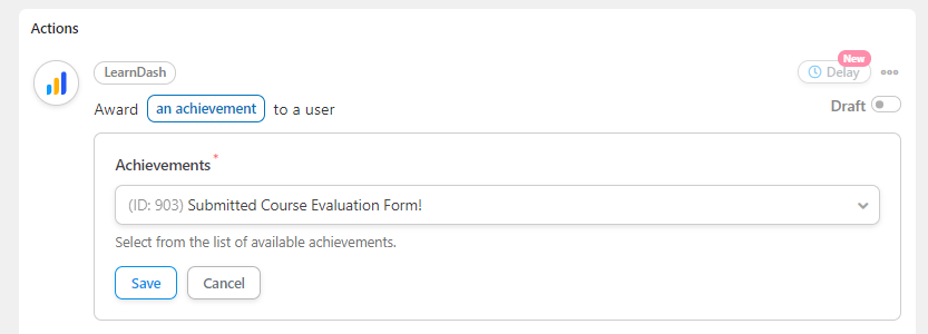 Let’s briefly show you how to use the Uncanny Automator plugin and the Achievements addon together with the help of an example – award an achievement to a user automatically for submitting a course evaluation form.