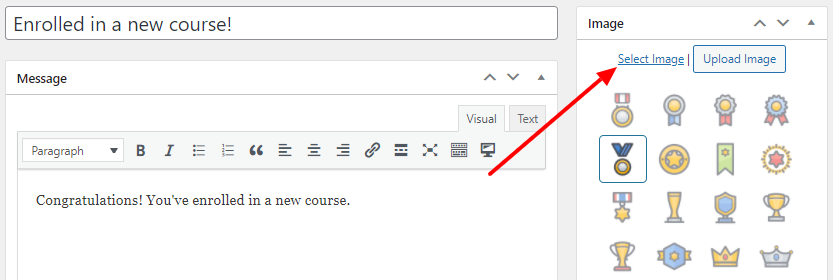 Next, you can add an achievement image from the Image box. You can select a pre-built image by clicking on the Select Image link.
