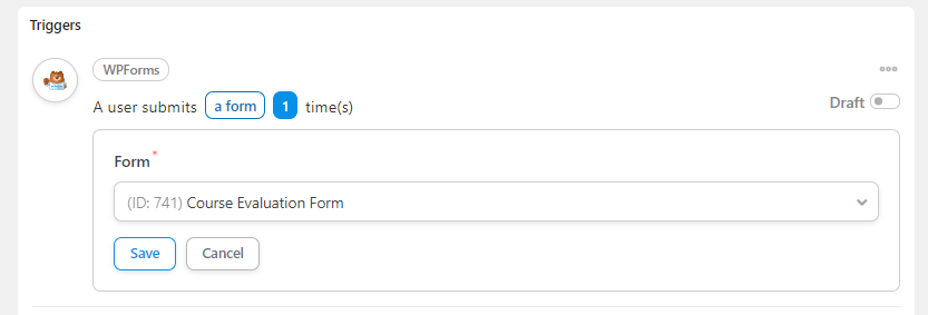 Selecting that option will open up the Form field. Just select the course evaluation form from the dropdown and then click on Save.