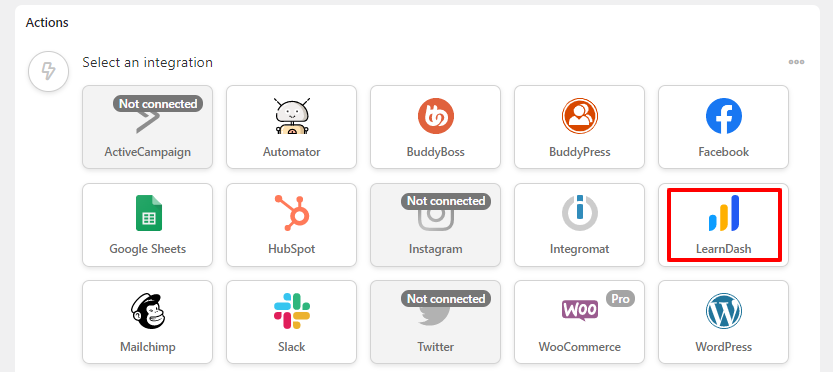 To configure the action, you need to first click on the Add action button. Next, you’ll have to choose LearnDash under Select an integration (the Achievements addon is part of the LearnDash integration in Uncanny Automator).