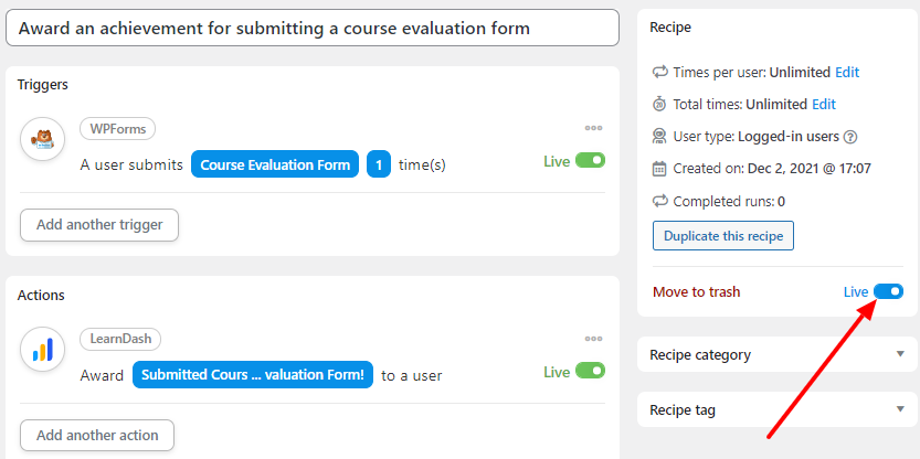 Your recipe is live now. That means, whenever someone submits the course evaluation form, you can automatically award an achievement to that user.