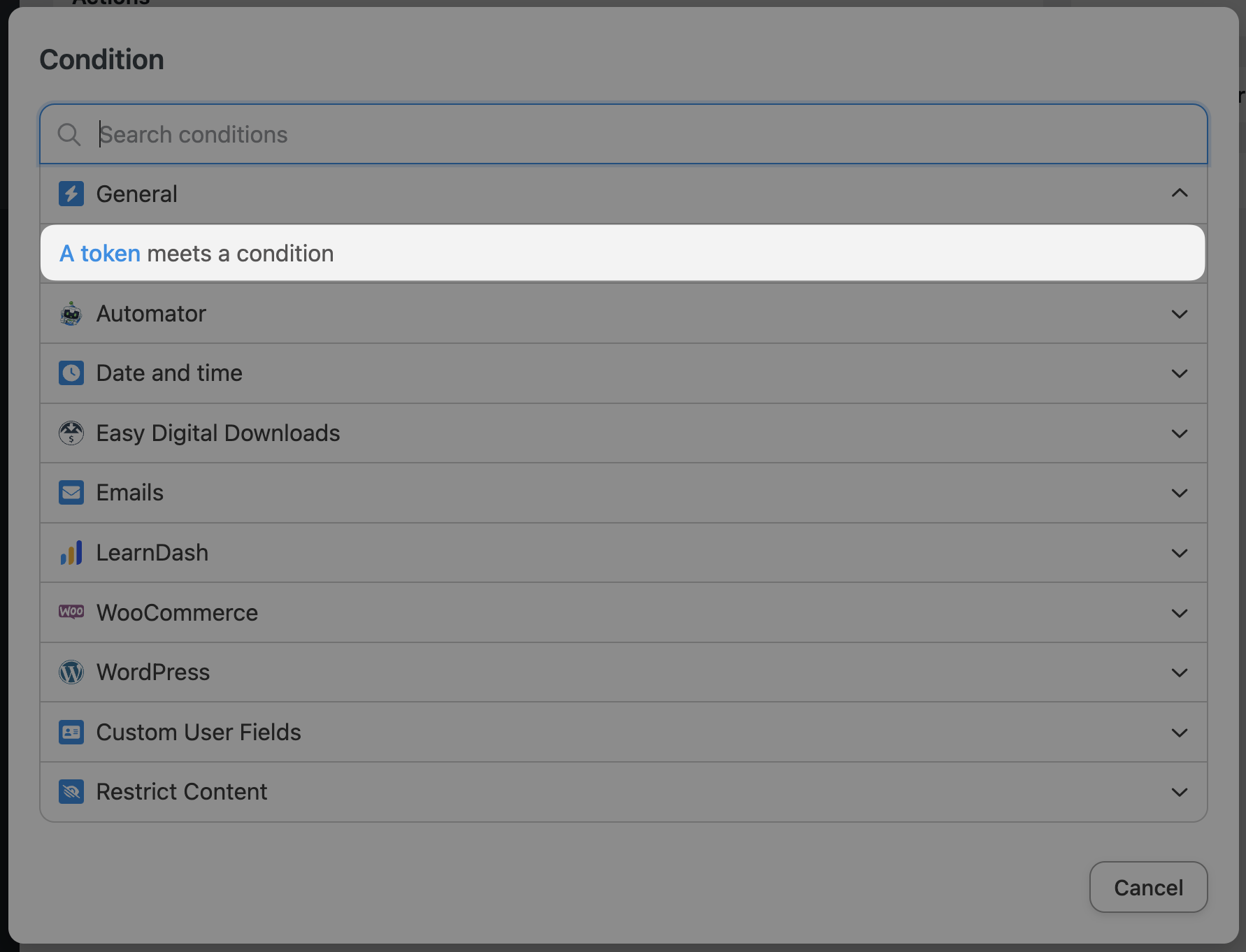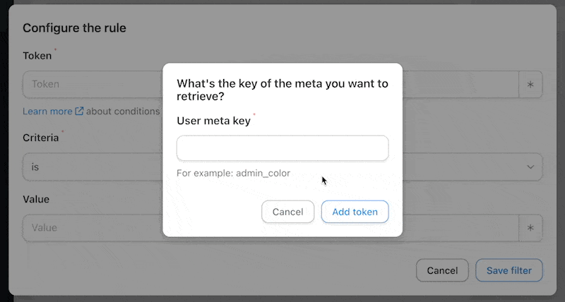 Automator will prompt you to configure the rule that defines the condition for the token. In the Token field, click the Asterisk and select Advanced > User meta from the drop-down list that appears.