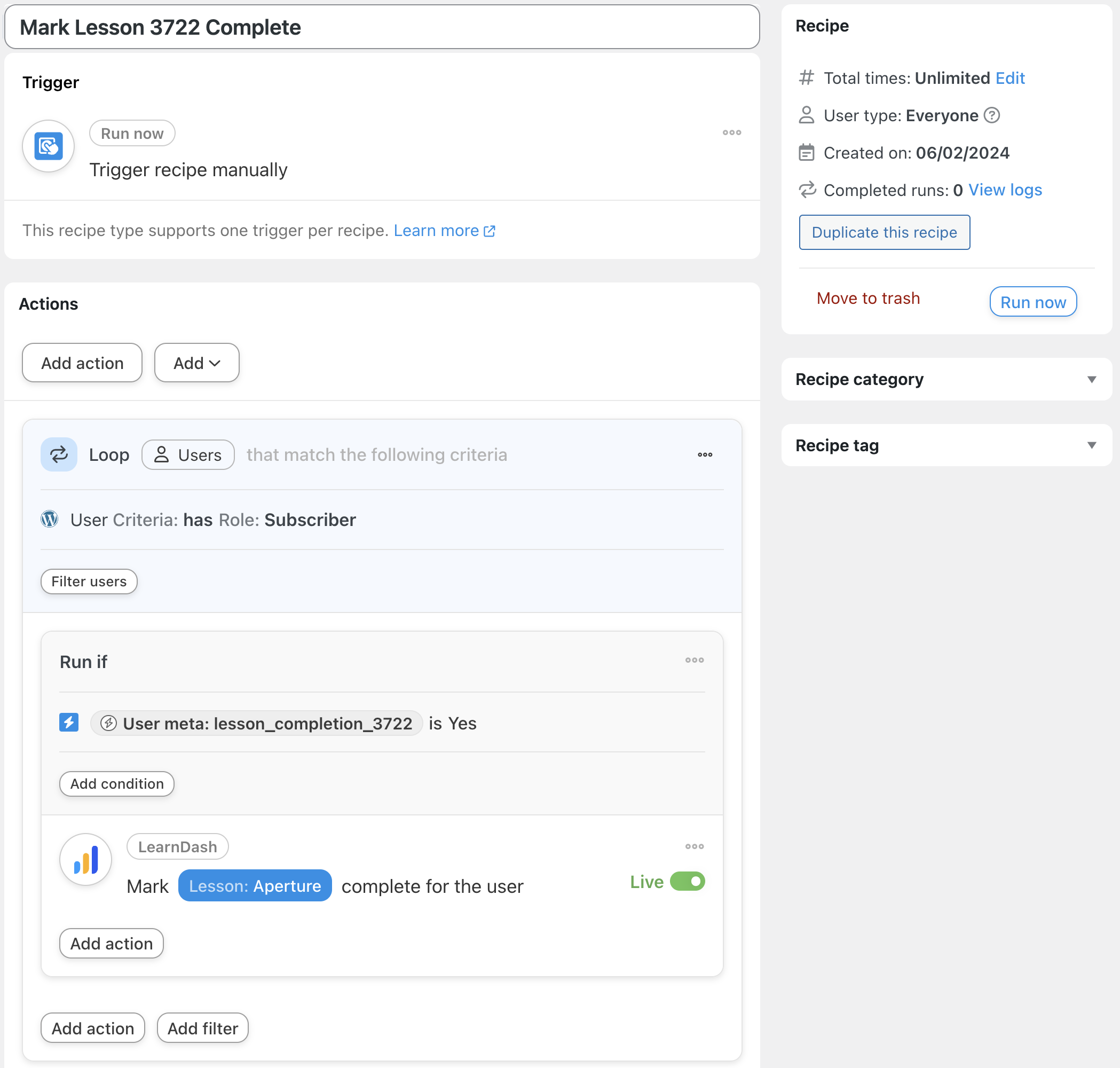 Once you click Run now, Automator will cycle through every user on your WordPress website that satisfies the user loop filter(s) and mark the LearnDash course complete for them if they have the user meta value(s) that you’ve specified.