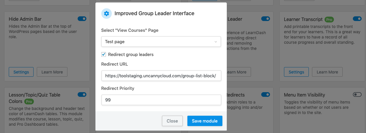 Improved Group Leader Interface: No more relying on third party plugins to redirect your Group Leaders! This module now supports login redirects for Group Leaders. If you use Pro with our Groups plugin, this is a great way to get your Group Leaders to land directly on the Group Management page.