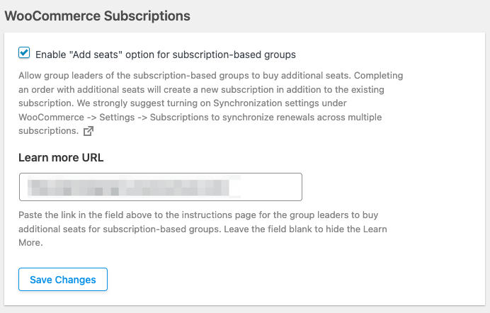 The WooCommerce Subscriptions settings for Uncanny Groups also allows an optional “Learn more” link on the Group Management page for users interested in buying more seats. If the field is populated with a URL, it should link to a page that explains the purchase process and how subscription renewals will work (e.g. if synchronization is enabled, this should be explained to the user).