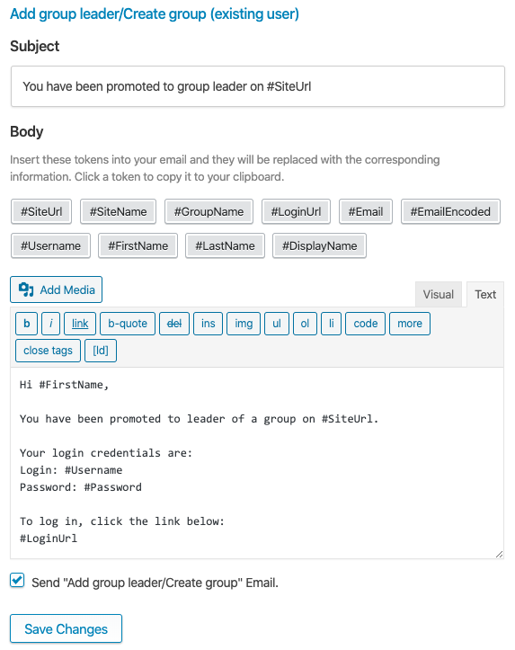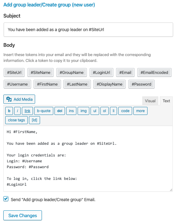 The Add group leader/Create group (new user) email is sent when a Group Leaders clicks Add Group Leader, or when an admin creates a new group using Uncanny Groups > Create Group, and the specified email address is not yet registered on the site. When this email is sent, the user is automatically registered as a new WordPress user and added to the LearnDash Group as a Group Leader. This template includes the #Password variable because passwords are randomly generated for new users. If you would prefer to have users select their own password, you can include a link to your site’s password reset page along with instructions to reset their password.