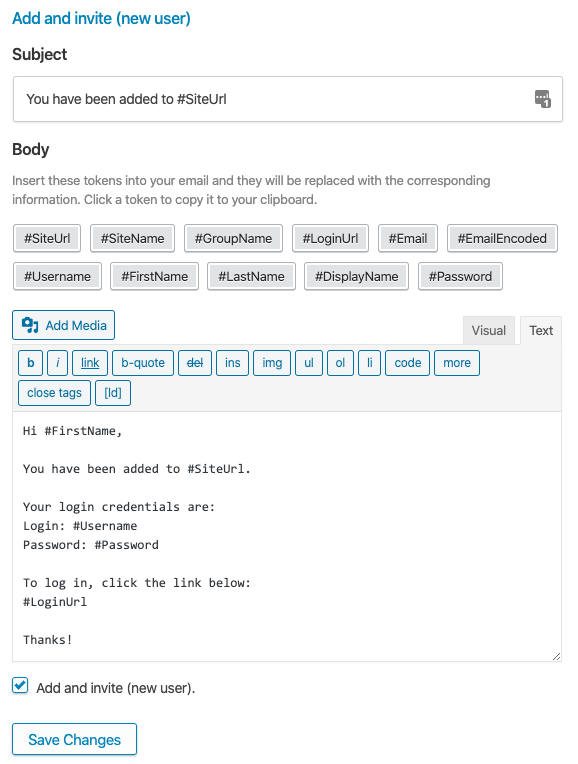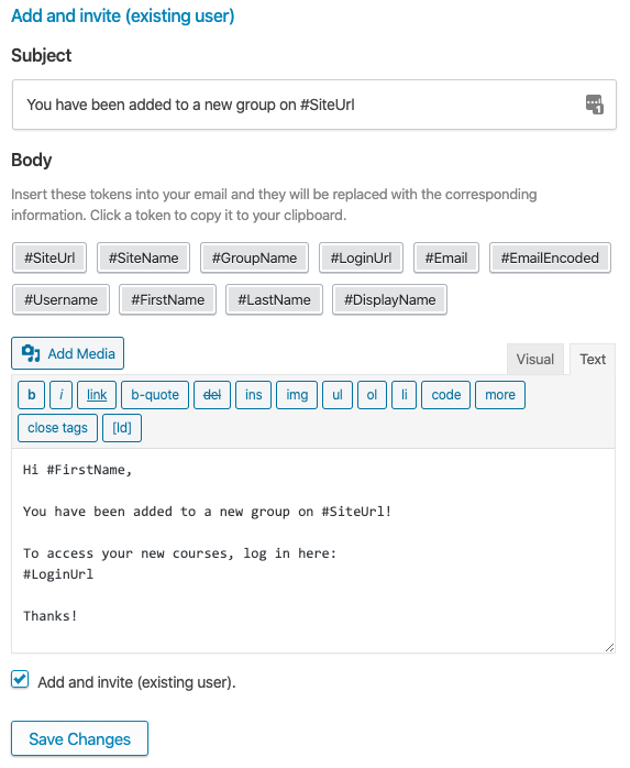 The Add and invite (new user) email is sent when a Group Leader selects the Add and invite option in the Add user dialog, and the user is not already registered on the site. When this email is sent, the user is automatically registered as a new WordPress user and added to the LearnDash Group. This template includes the #Password variable because passwords are randomly generated for new users. If you would prefer to have users select their own password, you can include a link to your site’s password reset page along with instructions to reset their password.
