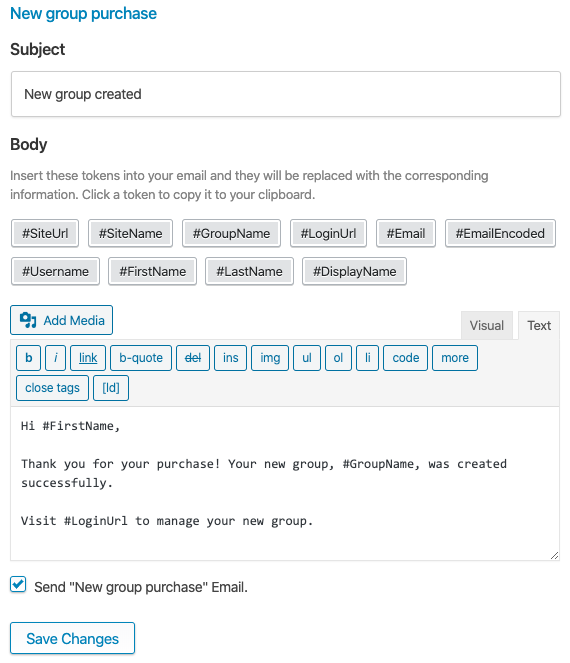 The New group purchase email is sent when a user completes a group license purchase via Woocommerce. Use this email to thank them for their purchase, confirm their group was created and provide a link to the Group Management page.