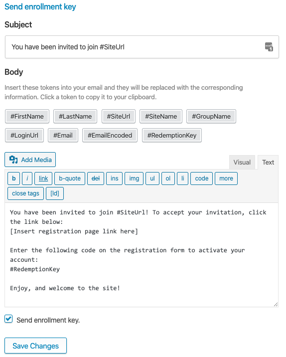 The Send enrollment key email is sent to new users when a Group Leader selects the Send enrollment key option in the Add User dialog. Unlike the Add and invite option, when this email is sent, users are not automatically registered on the site. So this email must contain clear instructions for registration. In this email template, make sure you include the #SiteUrl or #LoginUrl variable (so users can find their way to the registration form), and the #RedemptionKey variable which is the key for group enrollment.