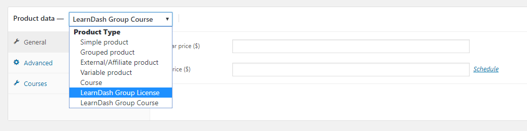 When you have Uncanny LearnDash Groups and WooCommerce activated at the same time, you’ll notice two additional product types added to WooCommerce: LearnDash Group Course and LearnDash Group License.