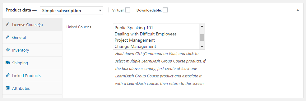 The following procedure details how to create LearnDash Group License products for sale for on a subscription payment basis. It requires that the WooCommerce Subscriptions plugin be installed and active.