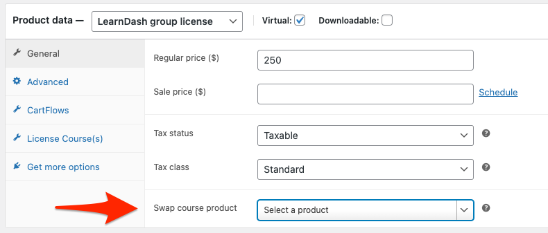 When a product is selected in the Swap course product field, the Group License product will be removed from the user’s cart when a quantity of 1 is added and it will be replaced with whatever is in this field. Typically, this would be a Course product type. A user buying a quantity of 1 of a group product would then end up purchasing access to a course instead. A selection in this field is optional and would only be used if you want to sell individual course access and group access to a course using a single product.