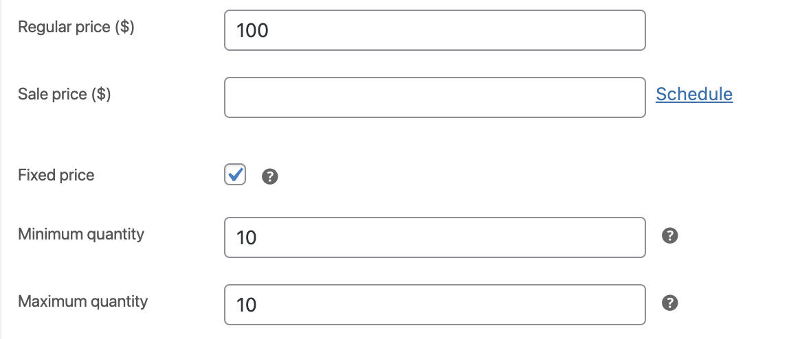 If a price is populated in the “Regular price” field and the “Fixed price” checkbox is checked, the price set here overrides the calculated price. It also ignores the number of seats purchased. In other words, if this were checked, 5 seats would cost $100 total and 500 seats would cost $100 total because of the override.