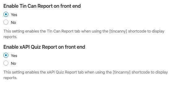 Note: The Tin Can and xAPI Quiz reports are not enabled by default.  To turn these reports on, go to Tin Canny Reporting > Settings in your admin panel and enable the appropriate options: