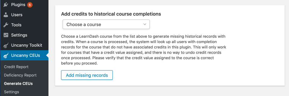 Version 3.2 of the Uncanny Continuing Education Credits plugin adds the ability to generate missing credit records. This means that students who completed LearnDash courses before installing of the plugin and/or before credits were assigned to the course can have a permanent record of the completion stored and a credit value assigned.