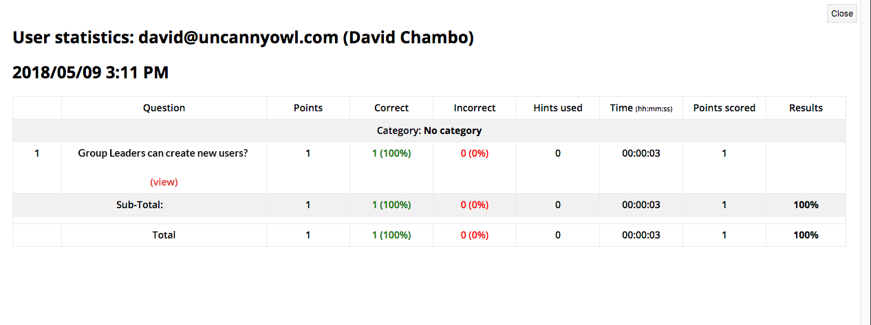 Clicking the icon in the detailed report column will open a more detailed view, per user, for each question in the quiz, including their answers (see Fig. 4).