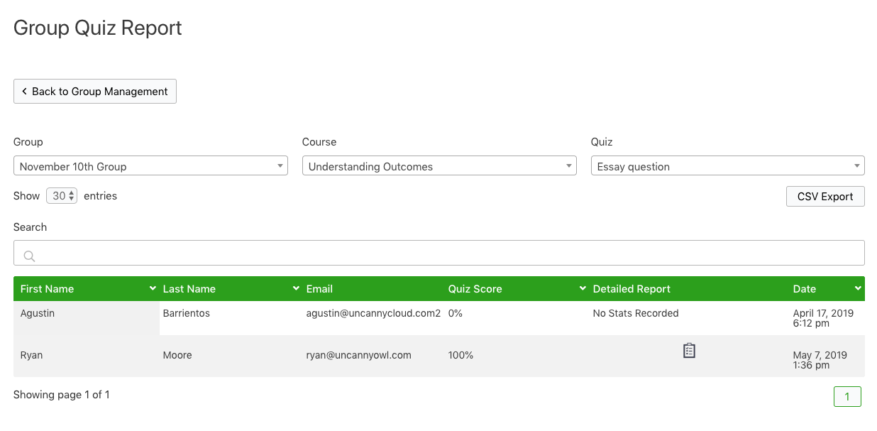 To view the Group Quiz Report, click on Quiz under the Reports menu. Select the desired group, course and quiz from the dropdowns. A table displaying all users’ results for that quiz will be displayed. If statistics are enabled for the quiz, you’ll also see links to a detailed report for each attempt. You can also export the results to a CSV file.