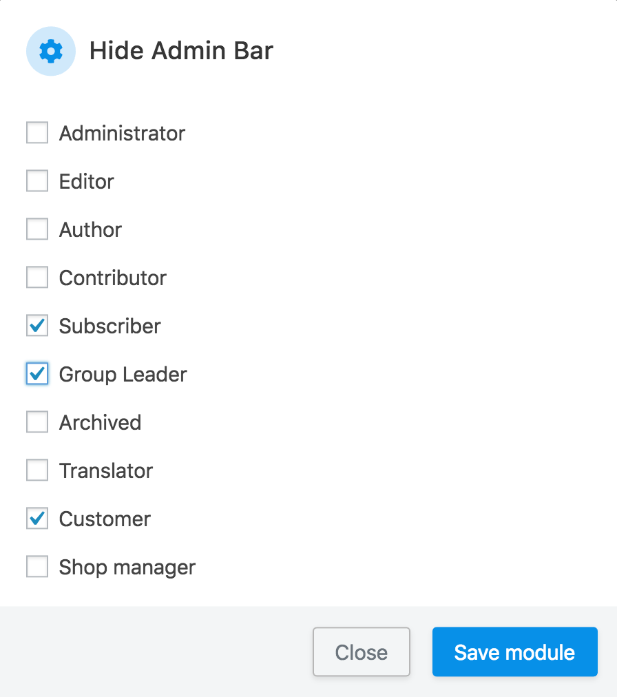 Enabling this module lets you turn off the black admin bar at the tops of pages for any roles that you want. Check off any roles that you don’t want seeing the admin bar and they won’t see it. For typical LearnDash sites, this will include the Subscriber and Customer roles.