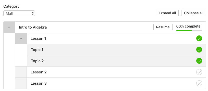 - A list of courses that can be expanded to show lessons, with each lesson also expandable to show topics