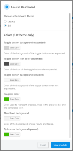 In version 3.2 we introduced the ability to switch between two dashboard themes. The original design is now the “Legacy” theme, and the 3.0 theme is a brand new responsive design compatible with LearnDash 3.0. There are several color customization options for the 3.0 theme available in the module settings.