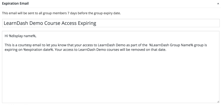 Beneath the expiration date is an Expiration Email metabox. You can set both the subject line and body for the notification email. In the body of the email, you can include variables for the user’s display name (“%Display Name%”), group name (“%LearnDash Group Name%”) and expiration date (“%Expiration Date%”). Variables are not case sensitive, but we recommend you copy and paste them from the list beneath the body text area. Use the Test Email button to sent a sample expiration email to the site administrator.