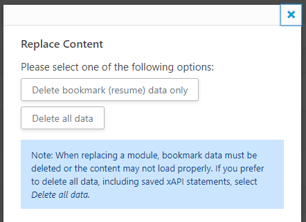 Delete bookmark (resume) data only: This option deletes stored the bookmark data that prompts users to resume from where they left off in the module the next time they visit it. This data must be deleted whenever content is replaced as internal bookmark IDs may have changed, resulting in the existing bookmark data preventing the module from loading properly.- Delete all data: This option deletes both stored bookmark data and stored xAPI statements (the data shown in the Tin Can and xAPI Quiz reports).