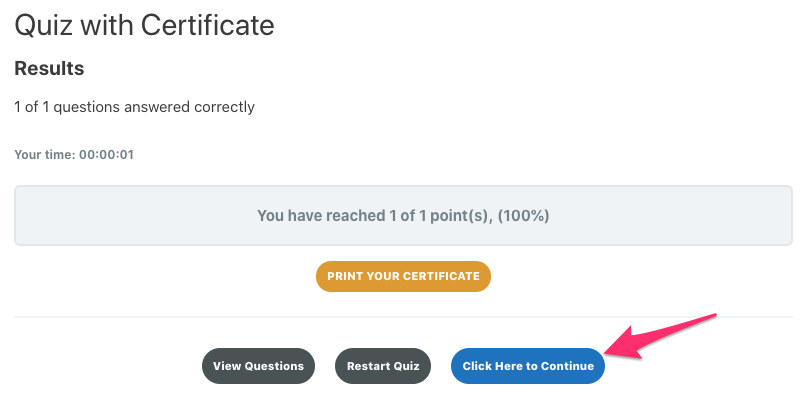 1. Do you mean the “Click here to continue” button? It wouldn’t be related to our module, but the first thing I would check is that the user passed the quiz. If you have a passing grade set, make sure you’re meeting or exceeding it for your quiz attempt.