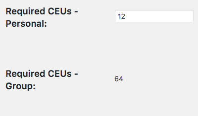 To set an individual requirement, simply edit the user’s profile. Look for the Required field as shown on the right (“CEUs” would be replaced by your plural credit label). Enter a number in the field and save the user’s profile to set the annual required credit threshold. (The Group field to the right is read-only in the user’s profile because it simply looks up the user’s highest required credits based on his or her group membership).