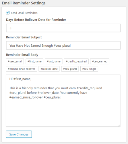 Included in the Continuing Education Credits plugin is an easy way to remind users about their outstanding credit requirements. By turning on email reminders, users will automatically receive an email X days before the rollover date to remind them about what they’ve earned and what they still need to earn. The number of days before the rollover date, the email subject line and the email body can all be customized.