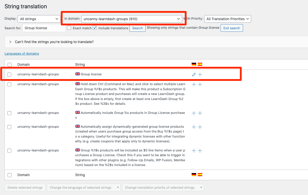 3. Select uncanny-learndash-groups from the In domain drop-down and a list of all text strings related to Uncanny Groups will appear.