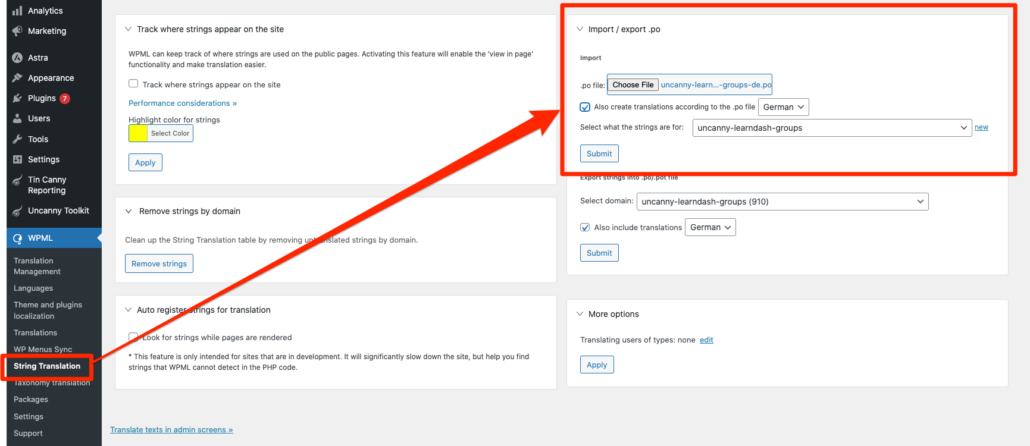 Steps 2 – Start adding individual string translations by navigating to WPML > String Translation.  Step 3 –  Select uncanny-learndash-groups from the In domain field.