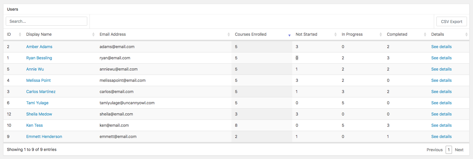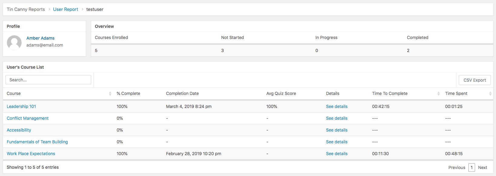 Clicking on the name or email address of a user will take you to a list of courses that the user is enrolled in as well as their overall progress in those courses.