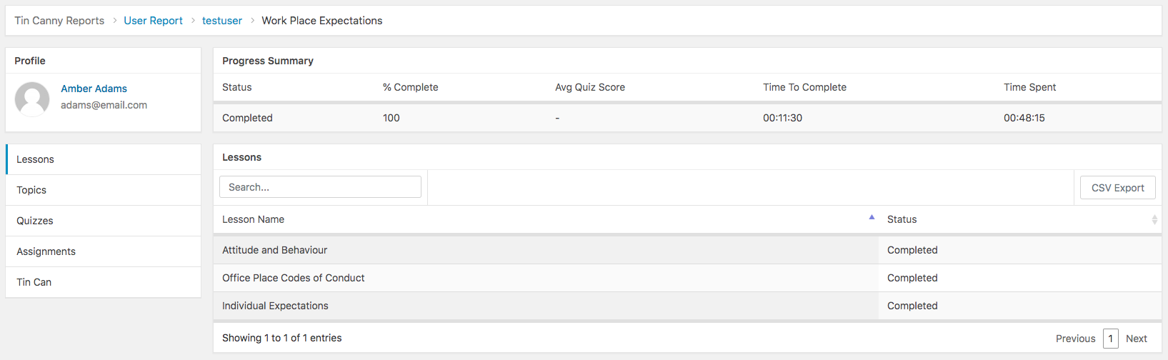 You can click anywhere in a row in the course list table to see the user’s progress in that particular course, including their overall performance and detailed activities of lessons, topics, quizzes, assignments, and Tin Can.