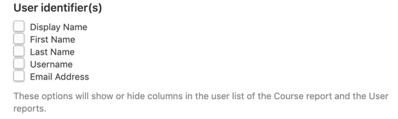 To change the user columns that are shown in the User reports, visit the Tin Canny > Settings page and look for the User identifier(s) section. Check or uncheck the columns you want displayed in User reports.