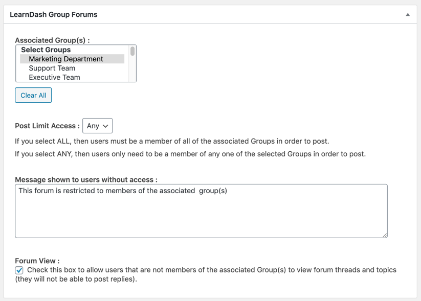 But that’s not all… to make it easier for group members to access group-specific forums, enabling this module adds a “Forum groups” widget which, as the name suggests, outputs links to forums based on the signed-in users’s LearnDash Group memberships. Add this widget to a sidebar available inside courses to provide easy access for students to their group-based forum(s).