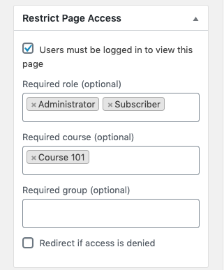 Administrators can set the page up to only be accessible to users based on their WordPress role, enrolled courses or group membership. All of these selections are optional, and all fields allow multiple values to be selected. Note that access for each restriction type (role, course or group) is based on users having any of the selected access. If you populate multiple restrictions (so values in both role and course, for example), use must satisfy at least one of the conditions from each section. In other words, based on the screenshot above, a page with these settings would be restricted to administrators with access to Course 101 OR subscribers with access to Course 101. It would be blocked for subscribers with no Course 101 access and to “Customers” with Course 101 access (assuming the user has the Customer role and not Subscriber).