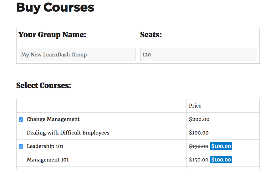 The screenshot above is what users see when they’re buying a course. They set the group name, how many seats they need, and what courses they want for their learners. But the best part is that they can add more seats and courses later. Groups created with our plugin are completely flexible and organizations can change them themselves as their needs change. No other plugin can do this. It’s an entirely new way of selling to organizations that want your courses, and it’s finally feasible to sell to hundreds of organizations without needing a full-time resource to manage everything.