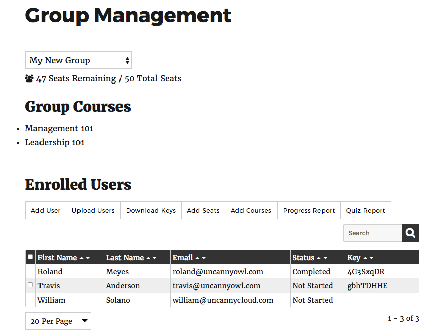 In the screenshot above you can see how easy it is for Group Leaders to manage everything from one place. See how many seats are available; review what courses the group has access to; add individual users; upload users; download codes users can redeem for group and course access; buy more seats for the group; add and pay for more courses for the group; see progress for group members at the course level; review all quiz completions and drill down into individual results; and manage group leaders (not shown). All of this is possible from a single page and from the front end of the site. We know many site owners don’t like giving access to the back end to Group Leaders, and this plugin goes a long way towards making that possible.