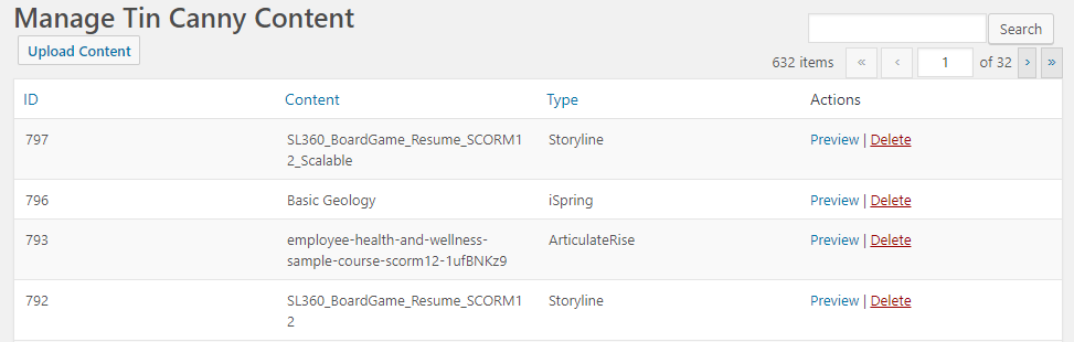 Outside of the Gutenberg-specific additions, we created a new page to find and manage your uploaded modules. The Manage Content page makes it easy to search through your uploaded Rise, Storyline, Captivate and iSpring modules, as well as preview them and delete them. No more having to dig through the Uploader tab in a post to look through and delete your modules (and we know many people didn’t even know that function existed).