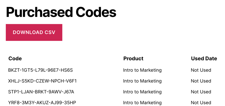 Let’s review what this means in practice. You, as a site administrator, generate 10,000 codes and define exactly what they will do. Then you can create a WooCommerce “Codes” product, and whenever someone buys a certain quantity, they receive that number of codes from the batch. They can even track whether or not they’ve been used. So say, for example, you create those 10,000 codes that you want to unlock access to 3 courses and a special membership level. A client organization then buys 100 of them. They receive an email with a CSV file of those codes (as well as a list in plain text) that they can distribute to their staff, so now they have an easy way to get 100 people access to those courses and membership. Another way to look at it might be as a way to sell 100 gift cards that are way easier to redeem (and far more flexible) than 100% off coupon codes.