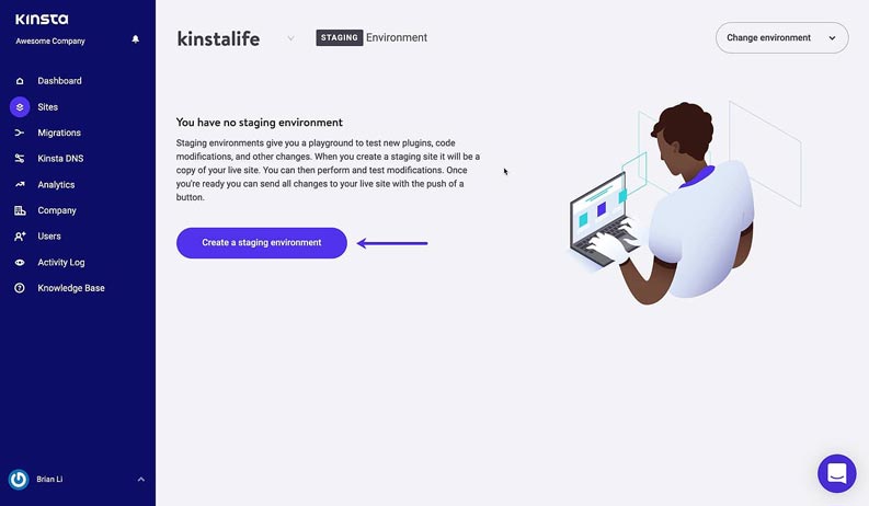 - Click on the one-click staging button to clone a copy of your live site to a staging environment.