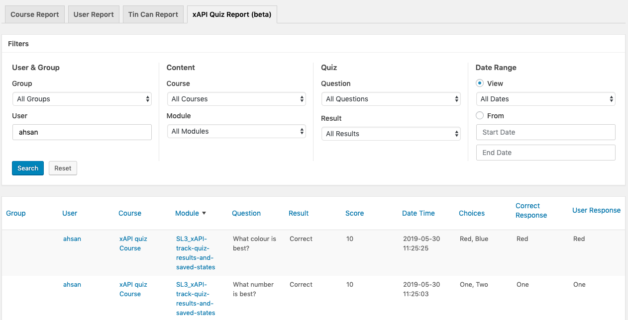 Sorry SCORM users, the beta report for quiz data supports xAPI only, but we’re looking at SCORM support for an upcoming release.